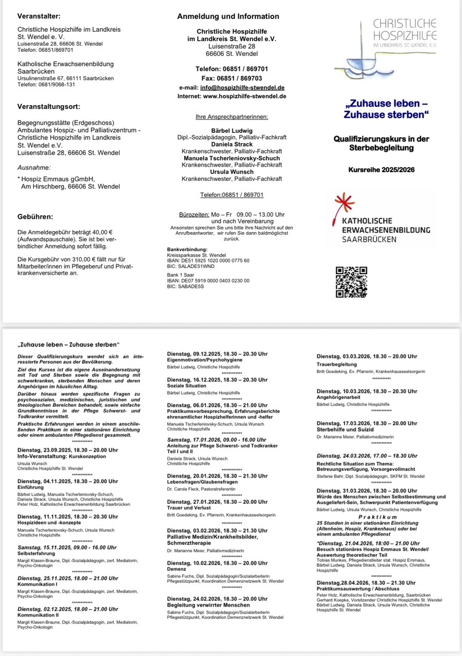 Infos, Kursprogramm und Anmeldung bei: Christliche Hospizhilfe im Landkreis St. Wendel e.V.,