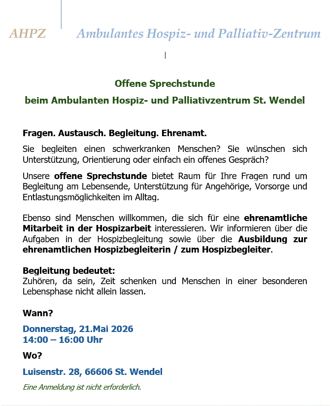Veranstaltungsort: Hospizbüro, Luisenstr.28, 66606 St. Wendel